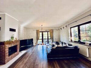 - Duży salon z kominkiem i wyjściem na taras wnętrze pełne klasy, światła i przestrzeni