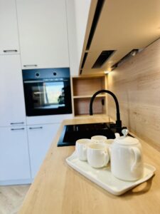 W cenie zyskujesz pełne wyposażenie od wygodnych nowych mebli na zamówienie po wysokiej klasy sprzęt AGD (lodówka, zmywarka, piekarnik, kuchenka).