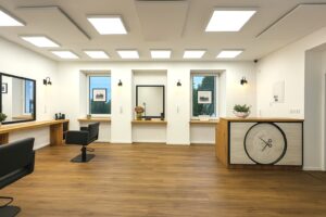 Pełne wyposażenie: stanowiska, myjka, meble, sprzęt fryzjerski.